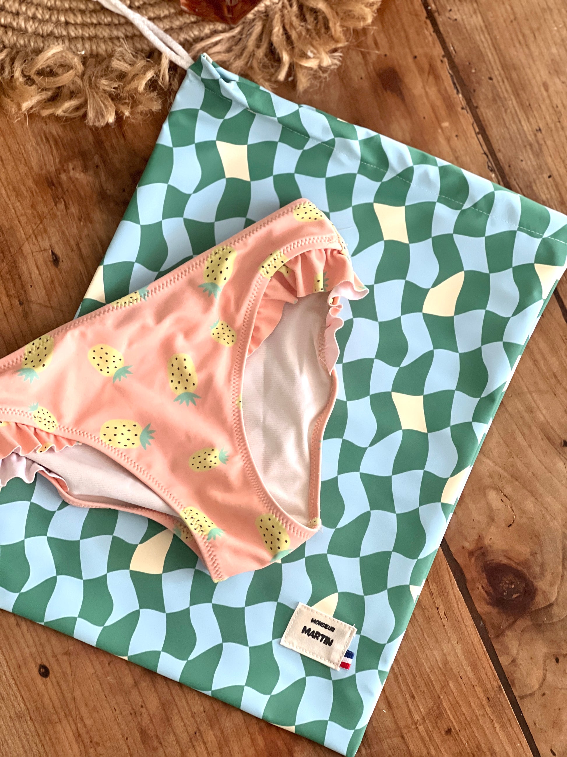 Son tissu damier vert funky apporte une touche tendance et décalée, idéale pour l’été.