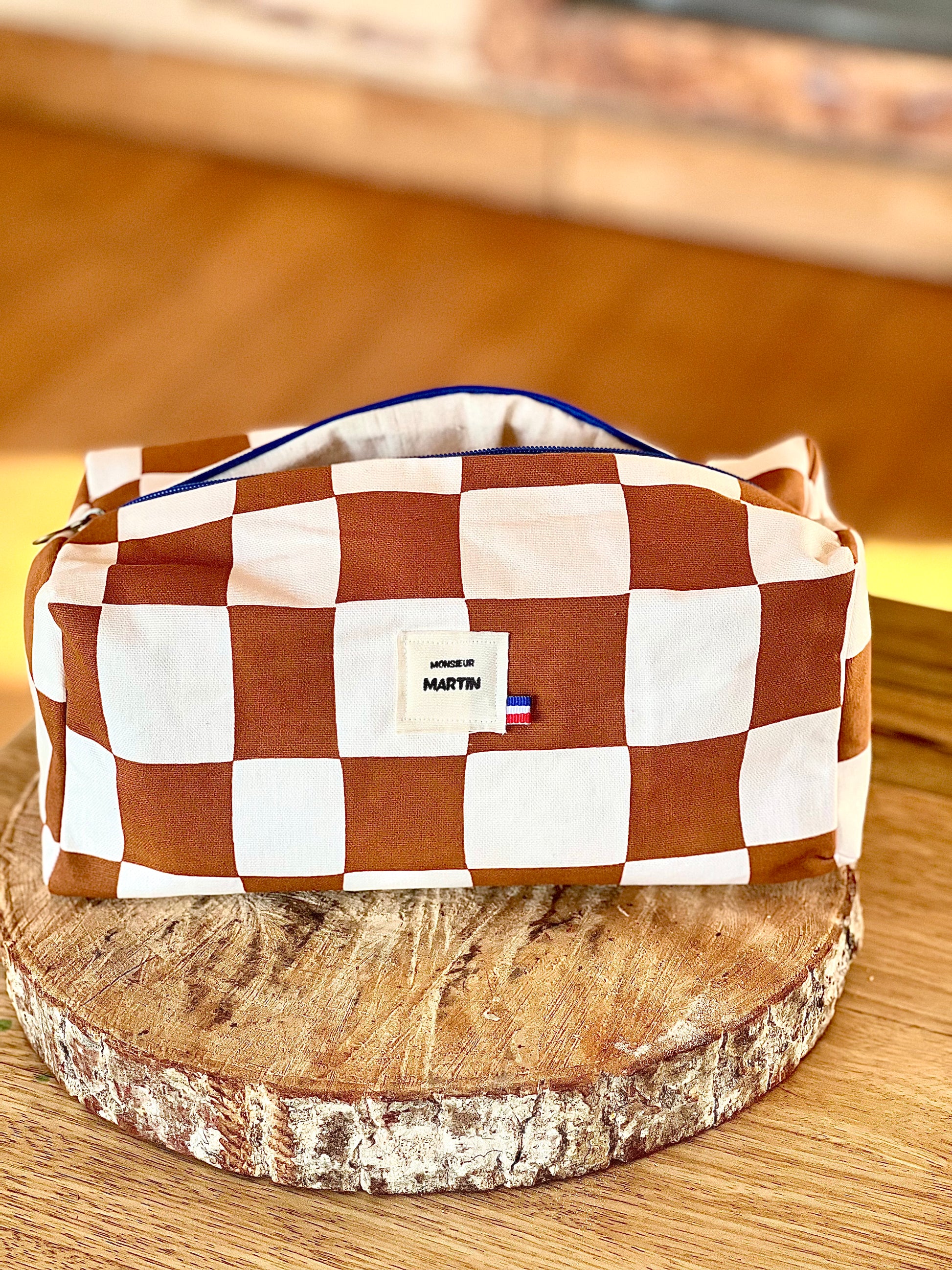 La trousse Billie est une grande trousse rectangulaire en coton avec son imprimé damier couleur camel pensée pour celles et ceux qui aiment les accessoires à la fois pratiques, élégants et durables. Grâce à sa taille généreuse et son design épuré, elle est parfaite comme trousse de toilette, trousse maquillage ou pochette de voyage.